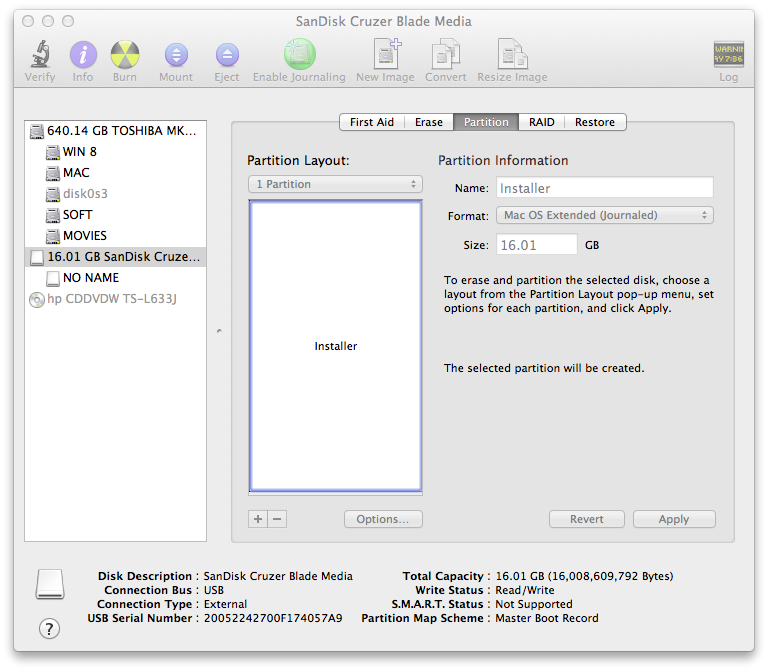 is set to “Mac OS X Extended(Journeled)”; name it “Installer”