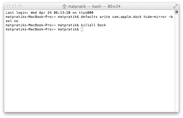 2:-“defaults write com.apple.dock hide-mirror -bool no”