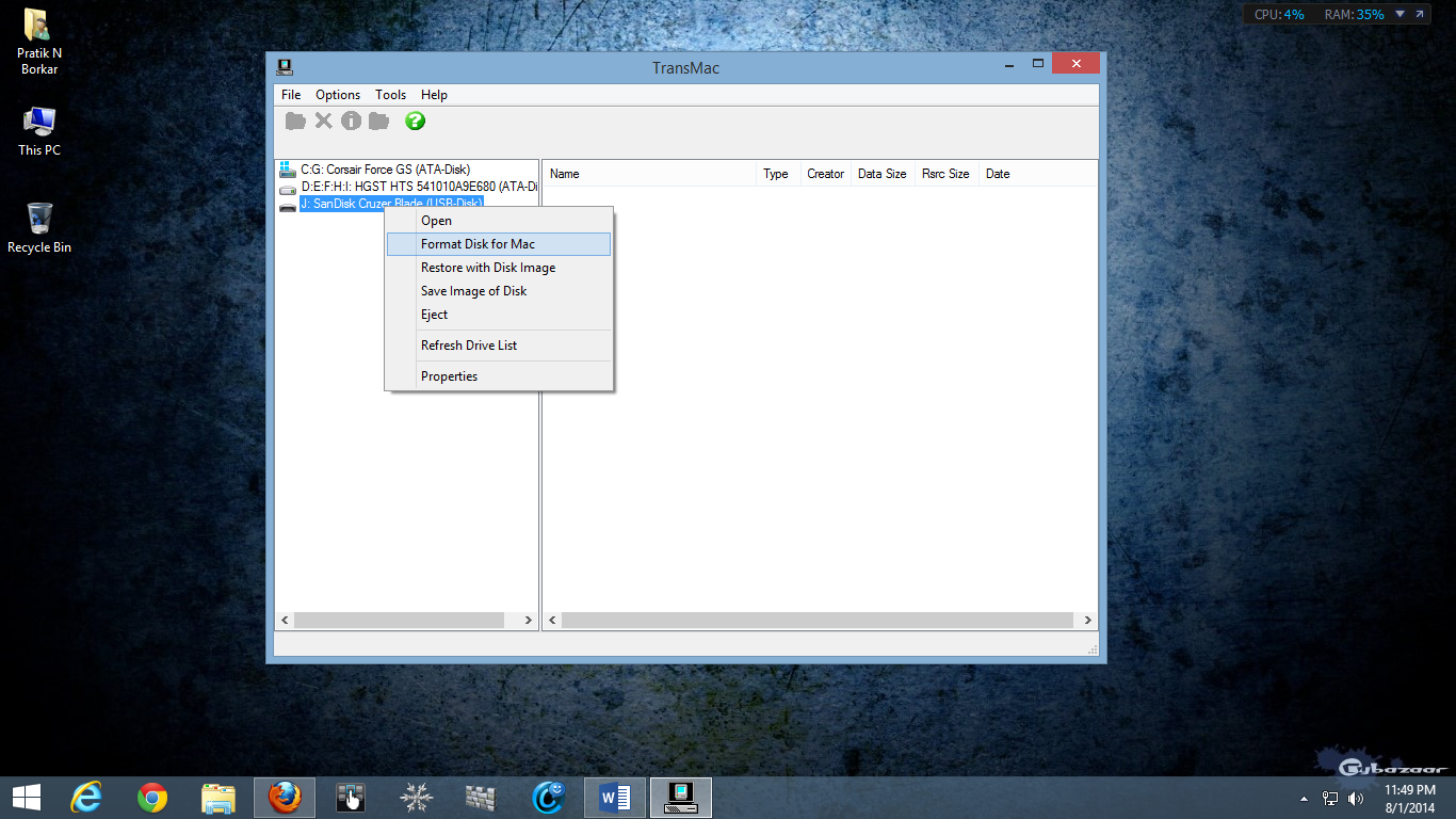 2.Once it is done, Select USB from the Sidebar again and right click=>Restore with Disk image.it will ask you the Location of your Image to the dmg